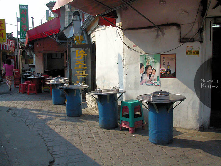 ソウル旧市街の目抜き通り・鍾路の北側に連なる路地裏の風景。2004年撮影。一帯は再開発が盛んだが、この界隈は2017年時点でまだ往年の景色をとどめている。写真の店はカルメギサルというブタの横隔膜の焼肉店。