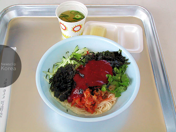 そうめん状の麺を野菜、キムチ、コチュジャン(トウガラシみそ)などで和える冷たい麺料理。比較的辛い部類。