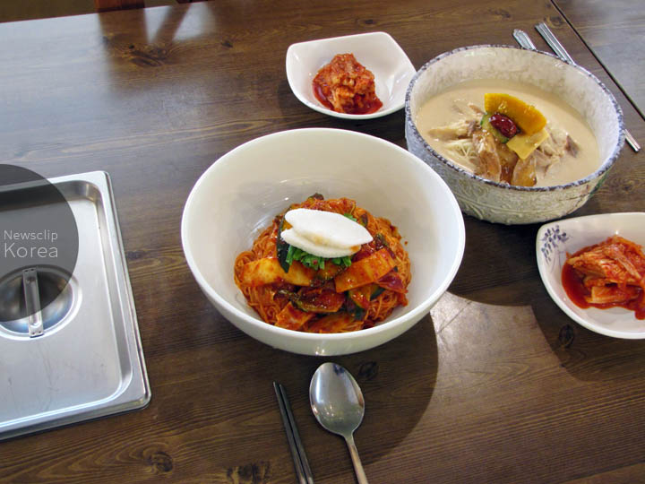 ピビムグクス(비빔 국수)はそうめんに似た麺をコチュジャンのたれで和える冷たい麺料理。