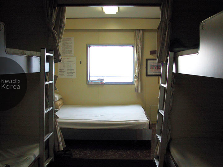 元は1989年に日本で建造された “フェリーあけぼの”。2003年3月から韓国の清海鎮海運が済州島・仁川間の航路で運航していた。窓際のセミダブルベッドが一等、両脇の二段ベッドが2等。