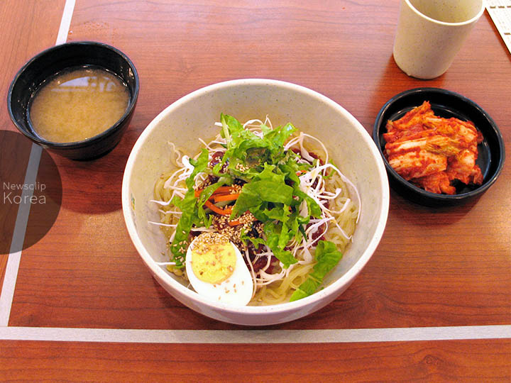 ハングルは “쫄면”。チョルミョンと読む。コシのある麺をコチュジャン(トウガラシみそ)で和えて食べる冷麺の一種。ソウル・ソレマウルの粉食店で。