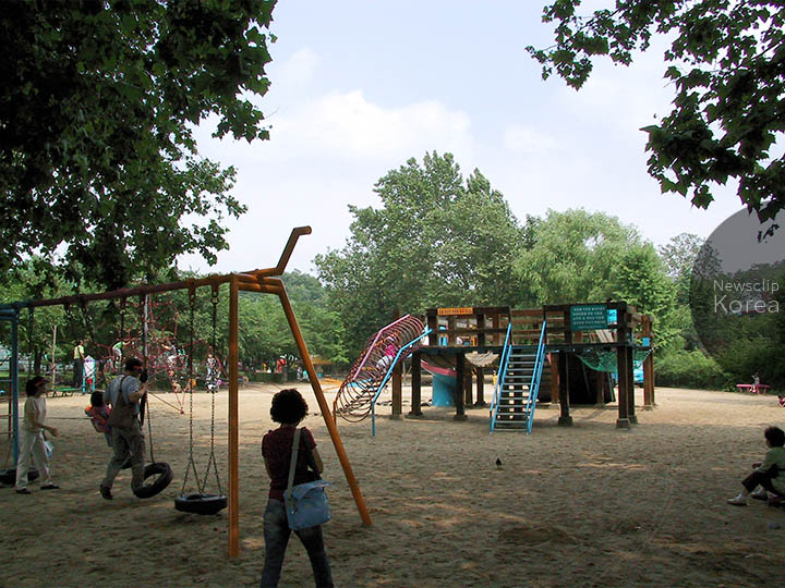 ソウル・広津区のオリニ大公園の一角。遊具の構造や色彩にも土地柄が表れる。