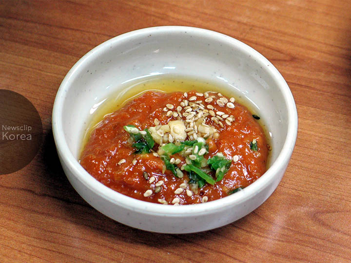 “サム” は “包み”、“ジャン” は “醤”。焼き上がった肉などを葉野菜で包んで食べる際の調味料。小皿から箸でひとつまみ取って載せる。テンジャン(みそ)、コチュジャン(トウガラシみそ)、ゴマ油、ニンニクなどを混ぜて作る。鍾路のテジカルビ店で。