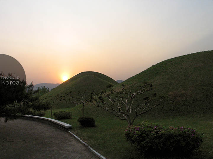 韓国南西部・慶尚北道慶州市の古墳公園。小山のような丸い盛り土は、大陵苑内に23基ある新羅時代の古墳。有機的な曲線が続く光景はユーモラスでもある。