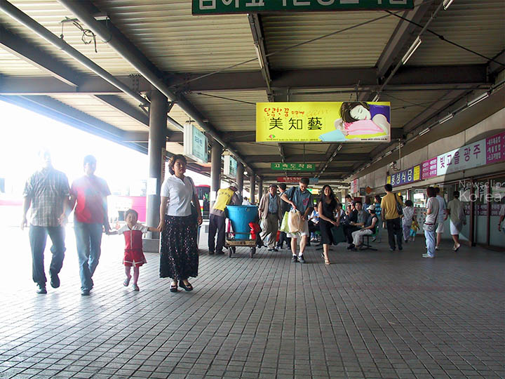 韓国南西部・光州市の長距離バスターミナル。1992年、市外バスと高速バスのターミナルを湖南高速道路IC近くに集約する形で新設された。2006年にリニューアルされ、内外装が新しくなっている。写真は2003年撮影。