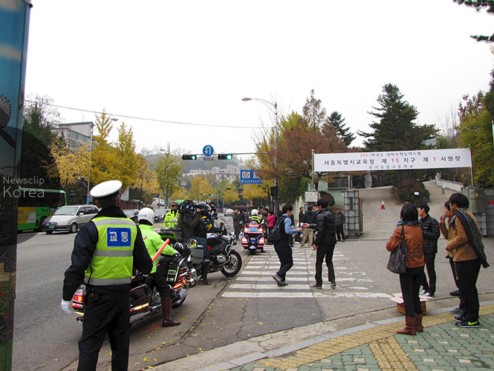 修能(スヌン / 수능)は大学修学能力試験(대학수학능력시험)の略。あらゆる4年生大学の志願者が受ける大学入試試験のこと。遅刻しそうになった生徒をボランティアがバイクで会場に送り届けている。左にはその様子を映像に収めるマスコミのカメラマンもいる。ソウル旧市街・紫霞門路の京畿商業高校で。