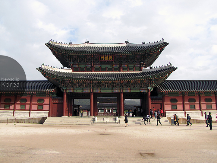朝鮮王朝の正宮・景福宮にある門。正門・光化門と正殿・勤政殿の中間に位置する。1395年に創建された後、豊臣秀吉の朝鮮出兵で1592年に焼失。1867年に再建されたが、朝鮮総督府の建設にともなって1912年に撤去された。1995年に朝鮮総督府が解体された後、2001年に復元されて現在に至る。