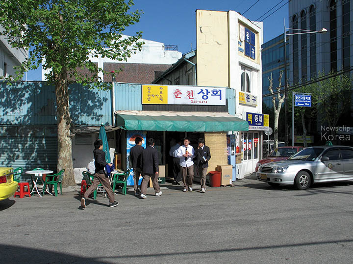 江原道・春川の高校近く。売店の向かって右隣の看板建築は、文具店。