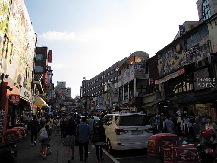 ソウル旧市街最大の繁華街・弘大。オウルマダン(어울마당)は祭りや余興またはそれを行う場所の意味。90年代の固有語見直しの動きにともない、大学生らの間で使われるようになった言葉だという。ただし通りに沿って駐車スペースが並んでいることから一般に駐車場通りとも呼ばれる。
