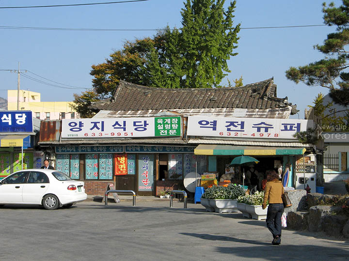 韓国鉄道・長項線の旧洪城駅を出て右手すぐの様子。商店の屋号は左が “日向食堂”(양지식당)、右が “駅前スーパー”(역전수퍼)。駅舎は2008年に300mほど移転し、駅前の景色もがらりと変わった。