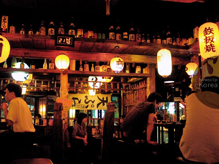 飲み屋の一形態として定着している和風居酒屋。横になった幟がなければ日本の居酒屋と区別つかない。ソウル・大学路で。