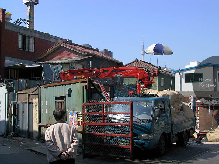 東大門市場の一角。クレーン車に不似合いなパラソルの向こうには恐らく日本時代の民家と思われる屋根、またその向こうにソウルタワーが見える。