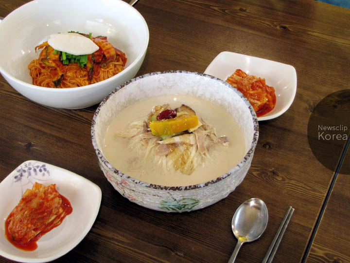 コングクス(콩국수)は冷たい豆乳をスープ代わりにした麺料理。冷麺の旬が冬なのに対して、コングクスは夏の味覚。初夏になると “콩국수 개시(コングクス始めました)” の張り紙が安食堂に貼り出される。