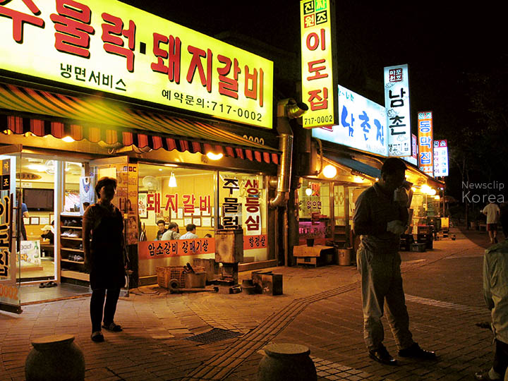 ソウル旧市街・麻浦区竜江洞。麻浦はかつて漢江の水運の拠点であり、1950年代に人夫らを相手にしたブタ焼肉の店がにぎわったという。60年代になって漢江の水運は衰退したが、ブタカルビの店が集まった一帯は仕事帰りのサラリーマンらが足繁く通うようになった。ただし現在はいくつかの店が流行りのビヤホールやチキンの店に商売替えしている。