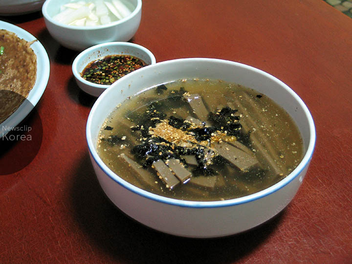 ドングリをゼリー状に煮固めた食材 “ムク”(묵)を具材に使ったスープ。動物系のだしに薬味とムクを浮かべ、冷やして食べる。忠清南道・徳山で。