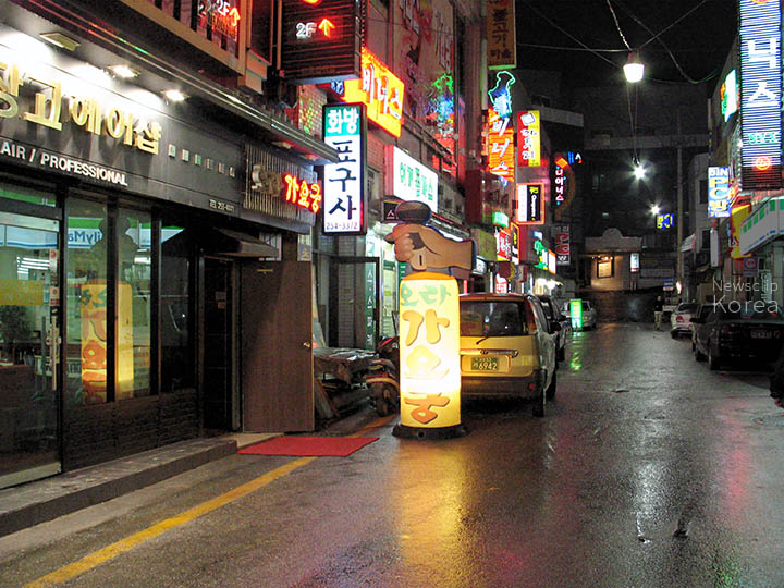韓国東北部・江原道の春川市の一角。純愛ドラマで有名になった春川だが、街の規模に比して大きな歓楽街がある。