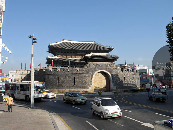 八達門は世界文化遺産に登録された18世紀末の城郭・水原華城の南門。水原市はソウルから南へ鉄道で1時間ほど降ったあたり。城郭をはじめとする史跡が庶民的な市街地とシームレスに溶け込んでいる。