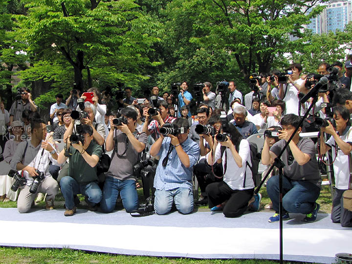 カメラを構える各種メディアのカメラマン。ソウル・南山で行われた従軍慰安婦関連のイベントで。