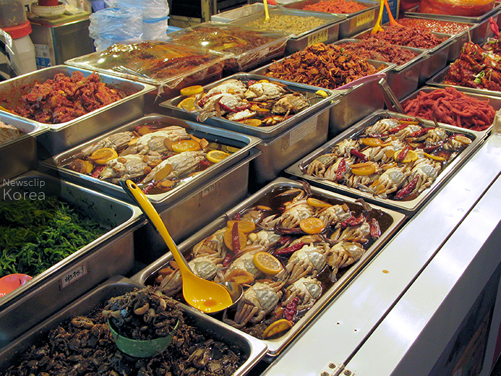 ワタリガニの醤油漬け。生のまま甲羅を割って身や内臓を食べる。ソウルの広蔵市場で。