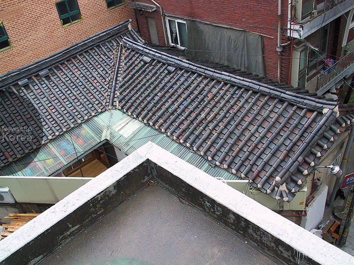 ソウル旧市街・鍾路5街の一角。恐らくかつては長方形だった敷地を対角線で切り取る形で残った韓屋。