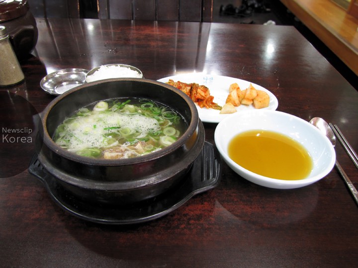 牛骨、牛モツなどを長時間煮込んで作るスープ料理。写真の店ではスープ中の肉を右のタレにつけて食べる。ソウル旧市街・城北洞で撮影。