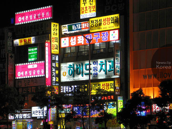 釜山のこぢんまりした繁華街。隣り合ったビル同士がそれぞれ美容外科の看板を掲げている。