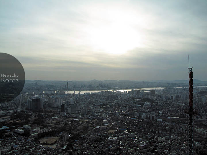ソウル・南山のNソウルタワーからの眺望。旧市街の南から南西方面を眺める。左右に流れる川が漢江。その手前の街は左手が竜山区、右手が麻浦区。