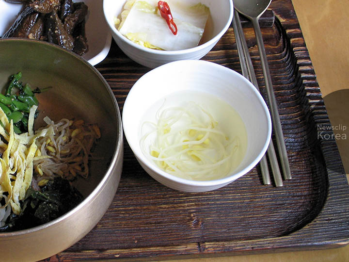 ソウル・弘大のビビンバ専門店で。豆モヤシのゆで汁を味つけしたスープ。韓国語では “コンナムルグク”(콩나물국)。素朴かつ清涼な味わい。