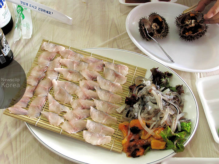 韓国北東部・江原道束草の海岸で。アイナメは “ノレミ”(노래미)、ウニは “ソンゲ”(성게)という。