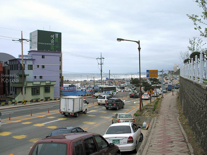 韓国東北部・江原道束草市。左手の建物の向こうに、行楽客向けの刺身店が並んだ通りがある。