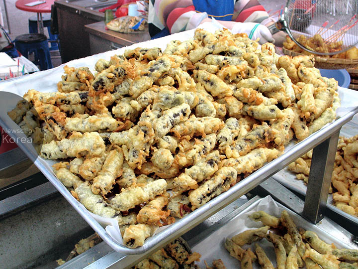 ソウル旧市街・麻浦区の孔徳市場で。スンデはブタの血液をモチゴメ、春雨、薬味などと一緒にブタの腸に詰めて茹でる伝統料理。写真は細長いスンデを天ぷらにした惣菜。
