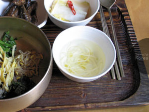ソウル・弘大のビビンバ専門店で。豆モヤシのゆで汁を味つけしたスープ。韓国語では “コンナムルグク”(… Read More