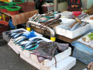 韓国南西部・全州の南部市場で。手前の角ばった物体はエイ。各地の市場でよく見られる光景。