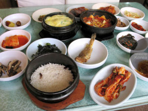 韓国南西部・全羅北道全州市の食堂で。メインのスープとごはんに、無数の惣菜が並ぶ。これで1人前。