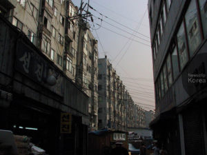 清渓川路から1本裏に入ったあたりのひと昔前の風景。並んでいる同じデザインの建物は集合住宅。