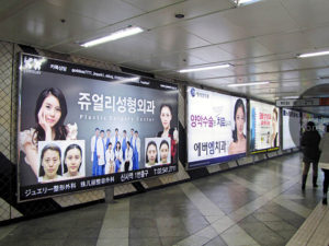 ソウルメトロ2号線・新沙駅地下通路で。左から3つが全て美容外科の広告。