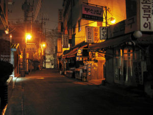 ソウル・景福宮の西側。真冬の深夜の様子。通りの突きあたりに見えるのが景福宮の壁。