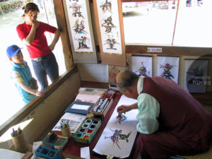 ソウル近郊・水原の民俗村で革筆画の実演販売を行う男性。