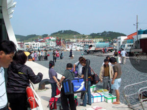 朝鮮半島南西端の港町・木浦から済州へ向かう快速船が、経由地の楸子島で行楽客を降ろしている。