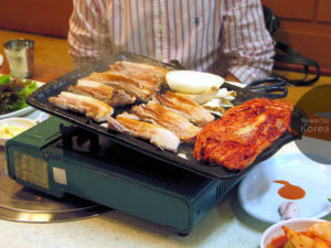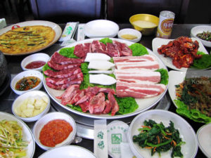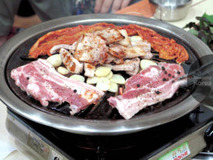 中央から右へサムギョプサル、デジカルビ、コプテギの順。いずれもブタ。コプテギは甘辛いタレに漬けたブタ… Read More
