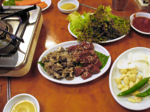 日本人向けの店だが地元の常連も多い。牛焼肉を中心に、典型的な韓国料理が並ぶ。