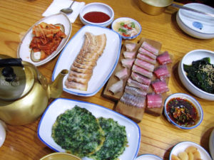 ソウル旧市街・仁寺洞の専門店で。中央右手、板の上に乗ったピンク色の切り身がホンオ(홍어)=ガンギエイ… Read More
