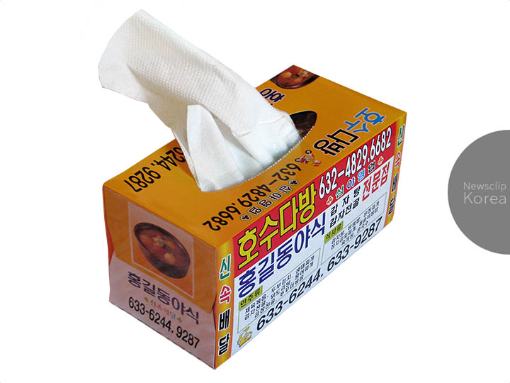 韓国中西部・忠清北道洪城市のモーテルで2004年に撮影。“モーテルのティッシュ広告1” と同じ客室に置かれていたが、掲載されている業者は異なる。これもカムジャタンなどの出前とともに、“チケット茶房” の広告が印刷されている。