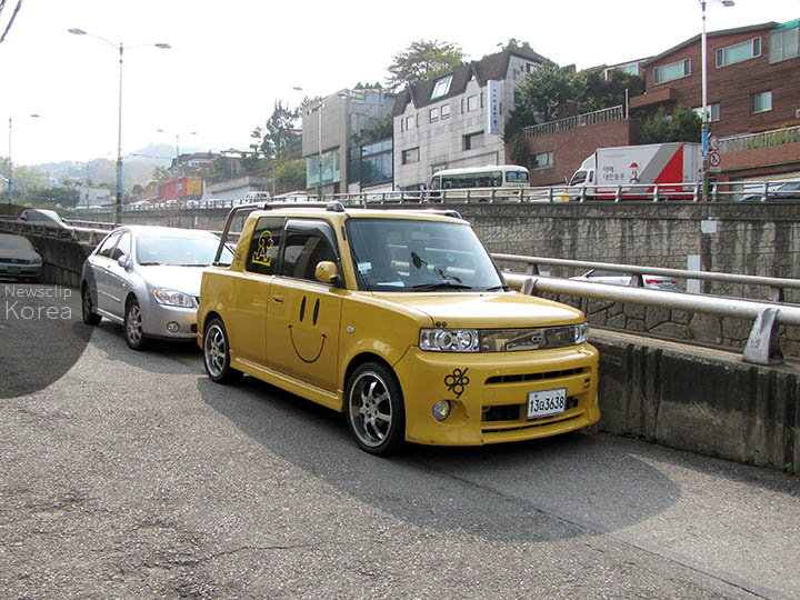 ソウル旧市街・付岩洞の近くで。2000〜2005年に生産されたトヨタbB。通常は5ドア車だが、写真は3ドアでリアをオープンデッキにしたレアなモデル。韓国ではなぜか2代目の日産キューブやこのbBのように、日本製の四角いコンパクトカーがよく輸入されていた。やがて2009年から似たイメージでよりデザインが先鋭的なKia Soulが発売される。